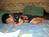 あっくんの寝顔はいつ見ても可愛いです。つらい事や悲しい事があってもやはり寝顔で癒されますわ。こうやって、うつ伏せで寝ているあっくん。ますますキスしたくなりますわ。(今離れているからそう思うかも)あっくんは眠くなるとグスグスしてて、自分がぐっすり眠れる場所を探してようやく見つけた所。ゴロゴロしたり頭の上に向けて動いたりしているんです。あっくんの頭の上には鉄のベッドなので危ないのよ…汗。押入れに布団を入れてあっくんもその上にのせたら、なあんとケラケラ笑い始めた。高いところが好きなのか、パパやママより高くてうれしいのか、ますますテンションUPです。何度もやらせても面白いそうです笑。