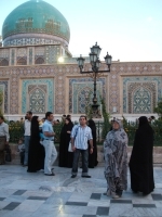 私はモスクを見るのが大好き。(モスクっていうのは、日本といったらお寺のこと。)カラフルなカラーで日本には見られない形だからかな?!夜でもライトまでカラフルなので、1日中モスクを見ても飽きないくらいですわ。そこで、日本に帰る前にマシャドへ行って来た。パパの弟とパパと3人で朝早くから飛行機に乗ってマシャドについて早速ハラメ・モタッハル広場へ行った。シーア派8代目イマームであるイマーム・レザーの聖墓があるんです。それほど有名なところなので、まだ7時ですが、やや人が通っていてイスラム信者はドアでも建物でもキスキスばっかりしていた。そこまでキスするくらい偉大な神様の墓なんだあと思ったけど、皆がドアや壁を触れしまう所なのにキスするとは汚いんじゃないか~と汗。そこにもモスクがすごく綺麗でした。でもイスファハン(場所名)の方がかなり美しいと思うなあ。イスファハンのデジカメで撮った写真が手元にないので、載せられません。あしからず。以下はマシャドへ行った時の写真です。それがモスクだよお。すごく綺麗でしょ。真ん中に立っているのはパパの弟だよ。金色のモスクはすごくまぶしかったが、印象強かったわ。