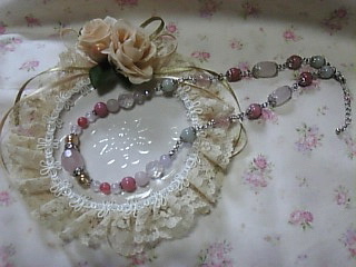 先日作ったブレスレットのネックレスバージョンが出来ましたo(^-^)o ネック部分にとても迷い、何回も作り直しました。 メイン部分はブレスレットと一緒なんだけど、少し長かったので天然石を減らしました。 ネック部分には、翡翠・ライトローズクォーツ(カット)・ピンクアベンチュリン・ローズクォーツを座金やメタルパーツで挟み、ライトローズクォーツには4mmのクリスタルオーラを一緒にピンに通しました。