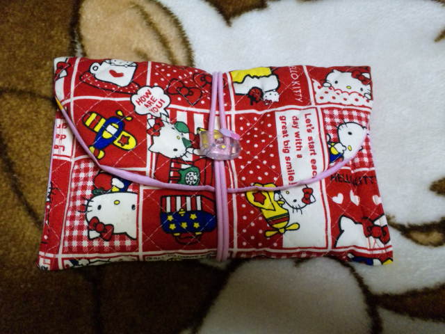 幼なじみに作ってもらいましたp(^^)q 今使っている物がちょっとボロボロになって来てて、生地を手芸センターに買いに行って渡しておいたの。 キティちゃんでかわいいでしょ? 裏地もセットで売ってるやつを買ったので、それも使ってもらいました~☆ しかも、私が昼寝してる間でしたf^_^; まだ生地残ってるから、また何か作ってもらう予定です。