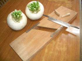 こないだ京都に行ったら、今が旬!!千枚漬って、いっぱい売ってました。 私は、千枚漬を家で作ります。案外、簡単に出来るので、お試しあれ。 まず、材料と道具ですね。 これは、聖護院かぶら京都府産 聖護院かぶら(LLサイズ 1個)という大きな蕪。主に千枚漬に使われるのかな? で、横にあるのが、千枚漬用のスライサーですね。京都の錦市場の有次で買えます。結構高いらしい。でも、あると、すごく簡単に千枚漬が作れます。なんでも道具だね。 まあ、小さい普通の蕪と小さいスライサーでも、お腹に入れば結果的には一緒です。ご安心あれ。 うちは、たまたま、道具と材料があるのだ。だから、作るともいえますが。 蕪は、このように、ちょっと厚めに皮を剥き、薄くスライスします。その時に、こういう方向ですると、葉っぱを持てるので、やりやすいよ。 スライスした蕪をかなり濃い目の塩水に漬けているところ。普通は、塩を直接するのですが、うちの姑は、濃い塩水に漬けていました。 この方が、塩か均一に回るのですね。これちょっとした、コツです。 3時間ほど塩水に漬けてしんなりした、蕪をこういう感じで、敷き詰めます。 そのあと、昆布を敷き詰めます。これを交互に繰り返す。 その後、甘酢をひたひたに注ぎます。 横から見るとこんな感じです。 いわゆる、ミルフィーユ状態ですね。 甘酢は、うちは、ミツカンの米酢か、千鳥酢 純米酢 1.8Lを使います。前に一回もらい物があったので、違う酢でちゃったら、えぐみがあって、えらい不味かったです。 蕪は、味が薄いので、酢はいいのを使ってください。 で、酢と砂糖と赤唐辛子を好みで混ぜてそれを、最後に注ぐわけですね。昆布が、酢を吸い込んでしまうので、半日くらいたってから、また、甘酢を足した方がいいです。 これで、出来上がりです、昆布も細く切って食べる時は、ちょっといい昆布を使ってくださいね。 いい酢といい昆布を使うと、これで結構高くつくので、千枚漬高くてもしかたがないかなあ、とか、思いますね(^・^)