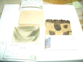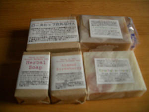 昨日、はなぴいさんから、石鹸をいただきました。全然、予期していなかったので、超びっくり&ハッピー!(^^)! 写真を撮る暇もなく、中を見てしまったので、封筒はお見せ出来ませんが、英字新聞を使って綺麗にラッピングしてありました。 角もきちっと、なっていて、日曜に行った大丸のへたくそな店員さんよりずっと綺麗で完璧な包装でした。 石鹸に、ひとつひとつついているラベルもすごく丁寧にびっしり細かい字で印刷してあって、私の大雑把さが、シミジミ~。 はなぴいさん、私は、こういうラベルは性格的に作れませんので、石鹸交換でお送りしても、がっかりしないでくださいね。 お願いします 石鹸ちゃんたちは、上の段左から、ローズヒップ豆乳、パイナップル豆乳カロチーノ+黒豆チャン 下ノ段、左から、 ハーバルソープ、アーモンドストロベリー、カラーボールイングリーンです。 どれも、手が込んでますねえ。 私、単純な石鹸しか作らないから、交換して送って怒られないかしら、心配になってきたわ…