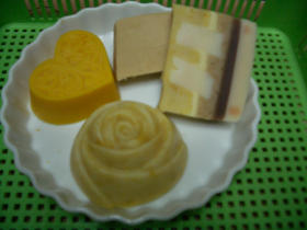 うう、またサンパギータさんで、12月新発売の石鹸買ってしまいました。 石鹸売るほどあるのに。 型出し終わった石鹸ちゃんたち、です。 ハートは、ククイナッツ入りです。赤パームが少し残ってたの入れたら黄色になってしまいました。 ベージュのは、アーモンド入りのミルク石鹸。 モンドリアンと勝手に命名したのは、いろんな石鹸が7種類入っています。切ったところによって、模様が違うのが楽しいです。 バラは、オリーブにアボガド、卵黄に、チンピ入りです。 かなり、しっとりしてる感じがします。