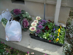今日は、とっても寒いです。 でも、明日からもっと寒いらしいので、諦めて、天気のいいうちに、花壇の植え替えをしました。 道行く人のやすらぎに、道沿いには、葉牡丹とパンジー。 その後、花壇を掘り返しておりましたら、桃ちゃんが飛んで来ました。で、球根を採りに行ったら、その隙に、花壇のど真ん中に鎮座しておりました。 すごく邪魔なんですけど。 おかまいなく。フカフカで気持ちいいんだもん。 やっと、どいていただいたのですが。 ママ、ママ、何してんの。花壇、土、フカフカになった? この子は、面倒くさいので、フカフカの土しか掘り返さない主義(ーー;) 見事に、埋めたのを掘り返してしまいました。 もっと、子供のころは、味見までしてましたが、最近はさすがに不味いのわかったらしい。 それを、もう一度、埋め戻すのですが、そのころには、球根が何がなんだかわからなくなってしまっています。 かくて、春になって花が咲くまで、桃がどんなデザインにしたのかわからない、うちの花壇であった(ーー;)。 教訓、犬とガーデニングは、両立しない。 この子のせいで、いくら花が枯れたことか。消毒もしなくなったしなあ。 まあ、可愛いから赦す。