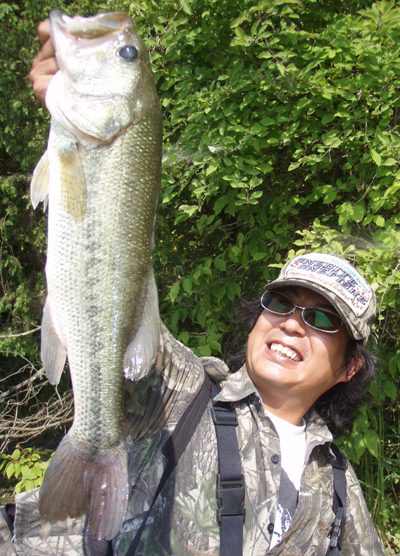 ローカル系ラーメンのらんめんでランチ後、目指すは錦柄のビッグカムルチー★カムルチーハンターw骸骨KENと合流し、期待の池に向う。。。が・・・ここも田んぼの影響が濃厚な濁り、何故か?ド満水サイトでさえ、見えたのは一度だけで全くの無・・・付近の池で有望なカムルチー池をランガンするも、埋め立て準備など悲しい状況。。。平地の池は全部、田んぼ濁りの影響がある夕マズメ最後に選んだ池は田んぼと全く接点のない山中の池へと移動。ターゲットはカムルチーじゃなく幻?の雷魚ライヒー★やはり山中♪断然水質がイイただ狙いのヒシシャローにはフェら師が陣取ってるのでw足場のいいストレッチのブッシュを撃つとコバッチの反応は良好♪ イメチェンのKENバブル時代のキッカワ風wなかなか帰らないフェら師。。。意を決してもう一度、チェストハイ装着を決行★ヒシ藻シャローに突入!まだ時期的には早いポイントだけど・・・この池で見かけたベイトは小型のツチガエル。その小ツチガエルパターンを操っていたKAZZ兄貴の方からゴツイ捕食音が聞こえた!ブチ曲がるサイドワインダー★えっ?えらい曲がってる?リア「KAZZさん!一気に抜いちゃいましょう!」KAZZ「ロッドがグラスなんだよ。」グラスでグラスwKAZZ兄貴、必死のパッチのポンピング★コメカミに浮く血管に・・・ちょっと心配・・・ 無事ランディング成功♪外道だけどwアーリーサマーの45up!ツチガエルをヒシ藻を蹴散らし咥えたのは超グッドコンディションの美しいビッグバス★ 最後に拙者のフロッグで本命のライヒーバイトが一度あったけど、早アワセミスwに終ってしまったデござるwww本命は釣れなかったけど最後の最後に季節を先取る美しいアーリーサマーのビッグバスと出逢え、満足そうなKAZZ兄貴のヤリ切った笑顔だったデござるwwwあ~超楽しいサンディだった♪ニンニン★