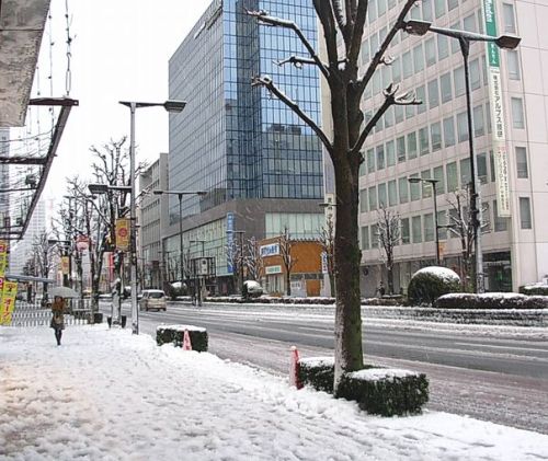 北関東・栃木の当地では、夜の間に降りはじめた雨が、昼前からみぞれや雪に変わって断続的に降り続き、午後4時現在、市街地にもかなり積もりました。 栃木・宇都宮市大通りで、午後4時頃写す。