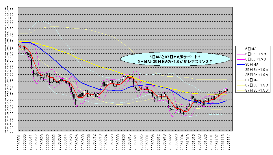 日足チャート   6日MA Bol1.9、35日MA Bol1.9、87MA Bol1.5入り