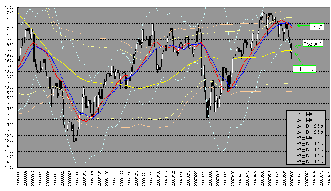 日足チャートですが、19日MA、24日MA 2.5σ、87日MA 1.2σと1.5σのみ入れてあります。