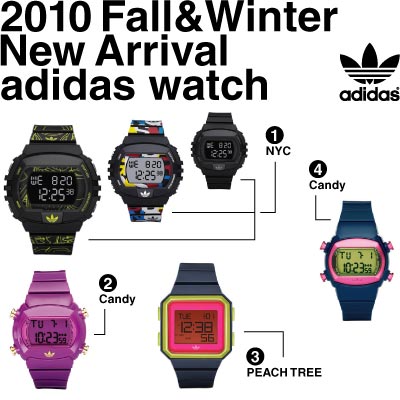 こんにちは!スガタ氏です!本日もマイスター神戸楽天ショップの新作情報をお届けしたいと思います!■□■adidas 新作WATCH■□■2010年秋冬の新作時計が入荷いたしました。人気シリーズにも新たなカラーが登場しました!マットな風合いとデザインプリントの施されたストラップが特徴の2010Fallの新シリーズ「NYC(ニューヨークシティ)」。NYC¥8925【全3色】「PEACH TREE」にも新作カラーが登場しました!PEACH TREE¥8925adidas Originalsの定番シリーズCandyに2010Fallテーマの「Dark Dreams」カラーが登場。Candy¥89252010 FW 新作時計はこちらからこちらからどうぞ今後も続々と入荷する予定ですので是非チェックしてみてください!