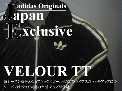 みなさんコンバンワ!いつもの菅田氏です。本日もスカジャン、ADICOLOR WIND JKTに続き新たな日本限定商品が入荷してきました!!!こちらです・・・VELOUR TT.TP毎シーズン好評となるブラック×ゴールドの3ストライプスのマッチアップに今シーズンはベロア素材のセットアップが登場しました。ベロアのもつ光沢感がシャイニーゴールドの3ストライプスとの組み合わせにより、その存在感がより際立ったアイテムになります。とても人気の商品ですのでみなさんお早めにお買い求めくださいね!ご購入はこちらから