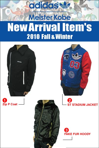 こんばんは!!本日もマイスター楽天ショップに新作商品が入荷してきました!今回の商品はなんと・・・日本限定商品です!1.Zip P Coat【全2色】 33,600yen斜めのジップが特徴的で、ファッショナブルでありながら、スポーティーなデザインのadidasによるPコート。ご注文はこちらから↓【ブラック】http://item.rakuten.co.jp/meister-adidas/o13515【カーキ】http://item.rakuten.co.jp/meister-adidas/o13514/2.ST STADIUM JACKET【全2色】 31,500yenフロントボディー全面に施されたオリジナルのワッペンが存在感抜群のメルトンスタジャン。グラフィカルなエレメントを豊富にもつブランドアイデンティティを強く主張するプロダクト。ダイアモンドパターンのライニングにはインシュレーションが施されることによって保温性も確立。ご注文はこちらから↓【ブルー】http://item.rakuten.co.jp/meister-adidas/o18824【ブラック】http://item.rakuten.co.jp/meister-adidas/o18825/3.FAKE FUR HOODY 31,500yen毎シーズン好評となるブラック×ゴールドの3ストライプスのマッチアップに今シーズンはフェイクファーのHOODIEが登場。ラギッドな印象のあるフェイクファーの素材感がシャイニーゴールドの3ストライプスとの組み合わせにより、その存在感がより際立ったアイテムに。ご注文はこちらから↓http://item.rakuten.co.jp/meister-adidas/o18821少量入荷となっておりますので是非お早めにお買い求めください!ではさようなら。