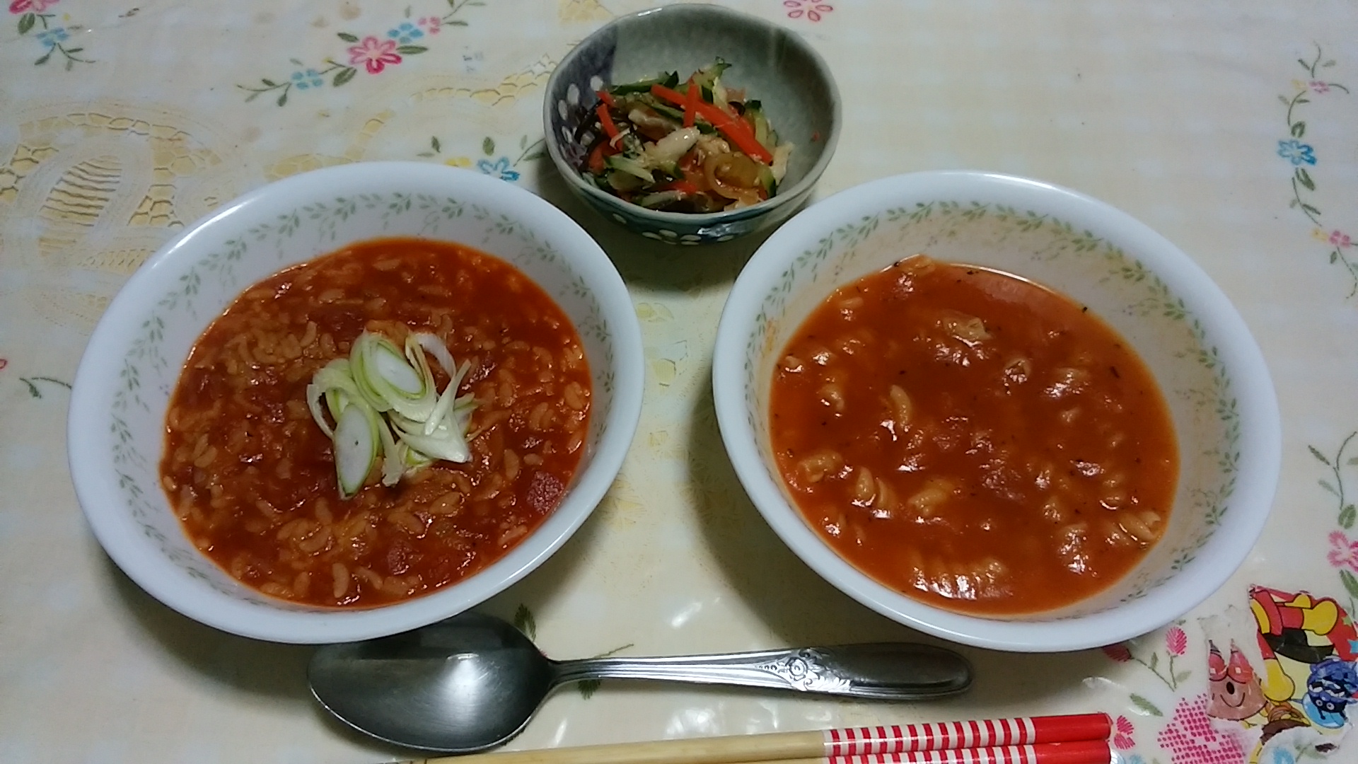 手前向かって左側は「トマトリゾット」食べたかったので、材料と作り方をインターネットで調べて材料購入して初めて作りました(*ゝω・*)ノ機会あればまた作りたいです。手前向かって右側は「完熟トマトのスープパスタ」これは作ればよかったのですが、残念ながらインスタントです(^-^;)そのうち挑戦します。奥の小鉢「鶏肉とくらげのサラダ」これはスーパーでのお惣菜コーナーで購入(^-^;)これも同上。