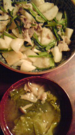 ここ数日、6時になっても、私がパソコンに張り付いていたり、書き物をしていたりするからか、チョロジが、味噌汁と野菜炒めを作ってくれますとても助かります。。。そういえば、このところ、夕食作りの時間、2階の自室で遊んでいる事が多かったチョロジです。段ボール箱や、広告の紙、空き箱、折り紙、などを使って、自分なりにラッピングしたり、絵本やおもちゃを詰め込んだり、どったんばったんと、何やらやっているらしく、あまり見に行っても嫌がるので、ほおっておいたのですが。。。ここ数日、時々1階に下りてきて、私の様子をうかがい、夕食の支度が始りそうにないと判断するとおもむろに台所を片付け始めるのです本日のチョロジの作品。カブの葉と実を豚肉と炒めた塩味の野菜炒め。&きゃべつとぶなしめじと豚肉の味噌汁。野菜炒めは、やや塩味が濃いめでしたが、炒め具合はばっちりでした味噌汁は、仕上げに味噌を入れるのとあく取りを私が一緒にやりました毎日、お料理でストレス解消出来たら、良いのになあと思ったりします昨年末あたりから、ちょっとイライラしがちなチョロジでしたが、そう言えば、その頃から、しばらくお料理の手伝い、していなかったなあと、気が付いたものですから来週には、春休みになってしまうので、(水曜日が卒業式です)お手伝い、自主的にやってくれると良いなあ夜中になってきて、ますます冷えて来ました。埼玉は、雪が積もってきています。。。お友達のikumamaさん、お誕生日おめでと~今日は、どんなケーキを食べたかなあ~にほんブログ村にほんブログ村にほんブログ村