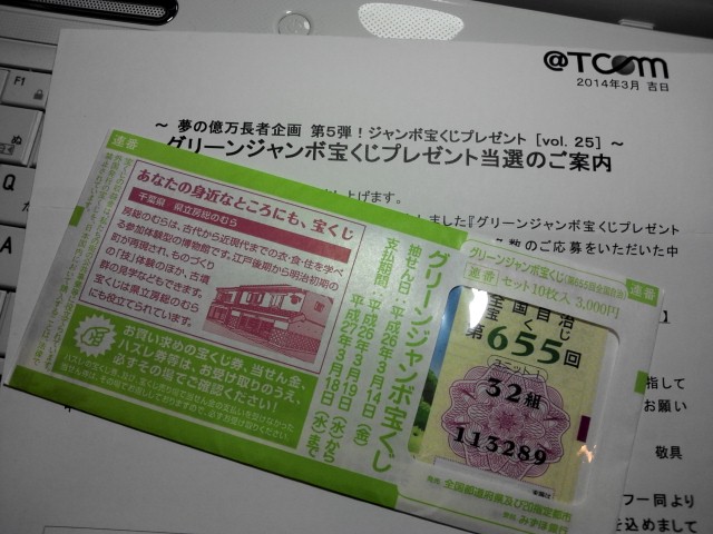 17日までだからと、気がせいていましたが、本日行って来ました、税務署へ。毎年、1時間以上並ぶので、今日も覚悟して行ったら、今年はかなり改善されていました。入り口では番号札をもらって、中に入ると座って待てるように。10人ずつの番号順で呼ばれるのですが、昨年よりも係りの方をかなり増やしている様子。けっこうスムーズに呼ばれ、待ち時間は30分もなかった。パソコンを自分で打てて、分からない時だけ聞く「セルフ」のコーナーは、もっと空いているようでしたが、私は全部聞かないと出来ないので、「パソコン出来ない」ルームにて待ちました。なので、係りのお姉さんはとっても丁寧で、なおかつ私が打ち込むのは金額の欄だけで、他は全部操作してくれて、打ち込んで下さる。速い速い!!生命保険で受けている個人年金の打ち込みで、お姉さんもちょっと疑問点があり、手を上げると更にベテランの係りの方が来てくれる。説明しつつ打ち込んで下さって、つつがなく終了。最後に印刷するコーナーでも、昨年は係りの方2人しかいなかったのに、4人いらっしゃるので、これまたスイスイ進む。すべて終わって出てくるまでに、1時間かかりませんでした!!お~、こんなに楽な確定申告は初めてでした。肩が凝る暇もなく終わって良かった~。戻ってくる金額は微々たるものですが、でも、やっぱり申告終わるとスッキリします(^^♪税務署の方、お世話になりましたそして帰って来たら、ポストにこれが入っていました。T-COMの宝くじプレゼントに、応募したのも忘れていた(^_^;)思いがけなく当選した~(^_^)/以前も宝くじ、頂いたことがあります。また当たるなんて、もうこれが当たった時点で、運を使っちゃってる気がするので、きっと宝くじは当たらないと思う。でも、何となく楽しみだよね(#^.^#)今日は1日、良い日だったなあと思いつつ。しかし、花粉はかなりきてますね。目と喉の痒さが半端ない(>_