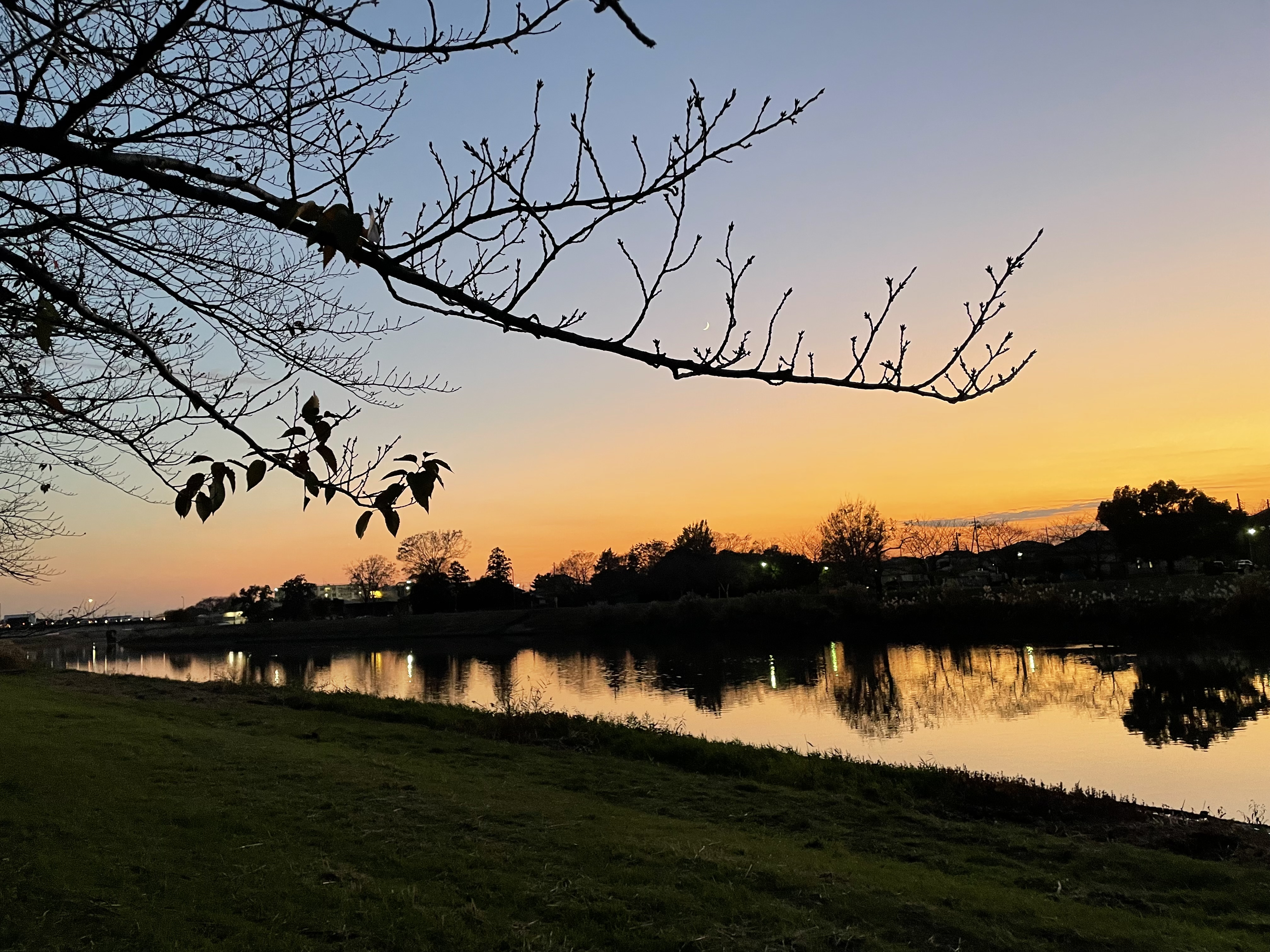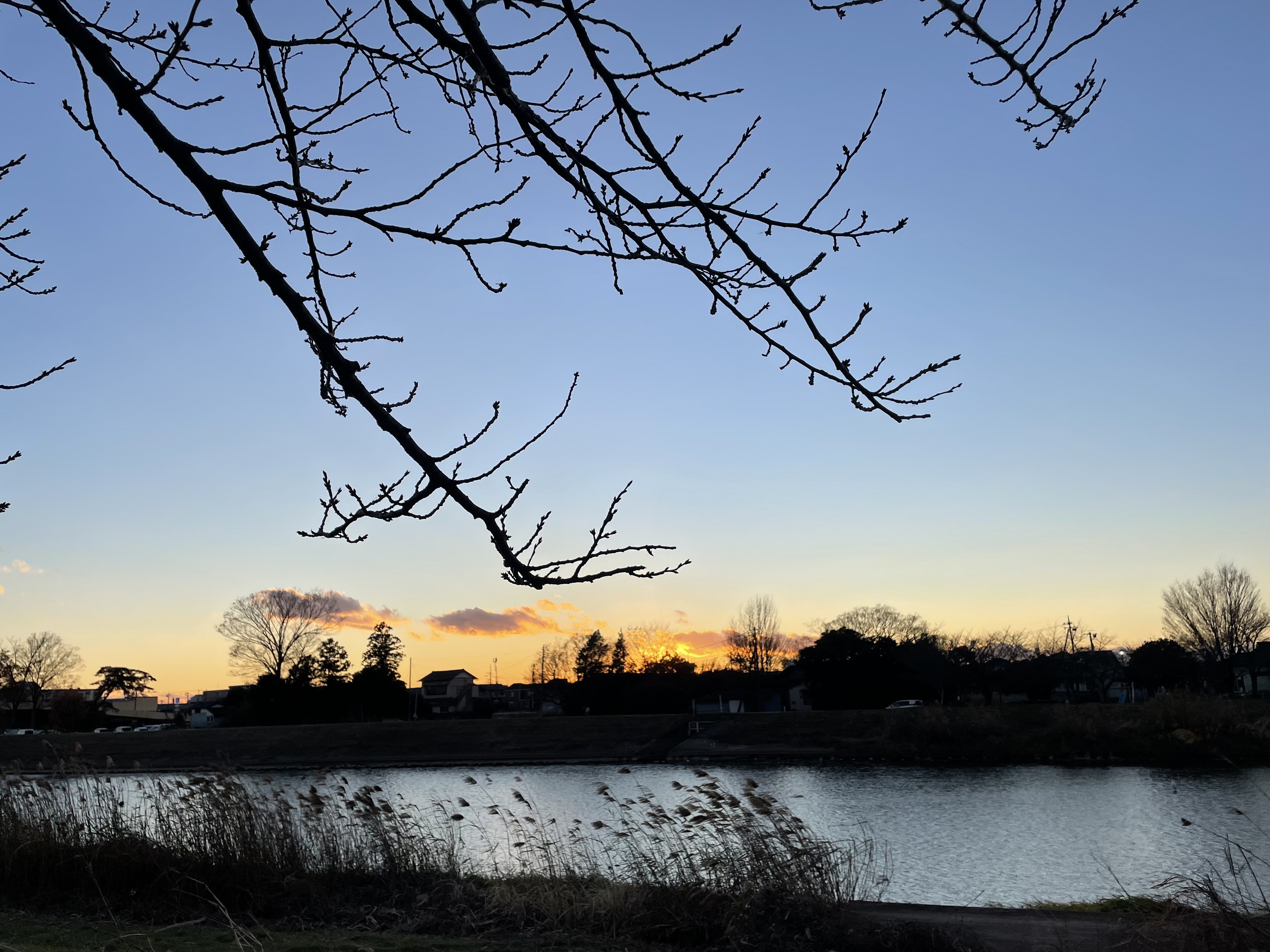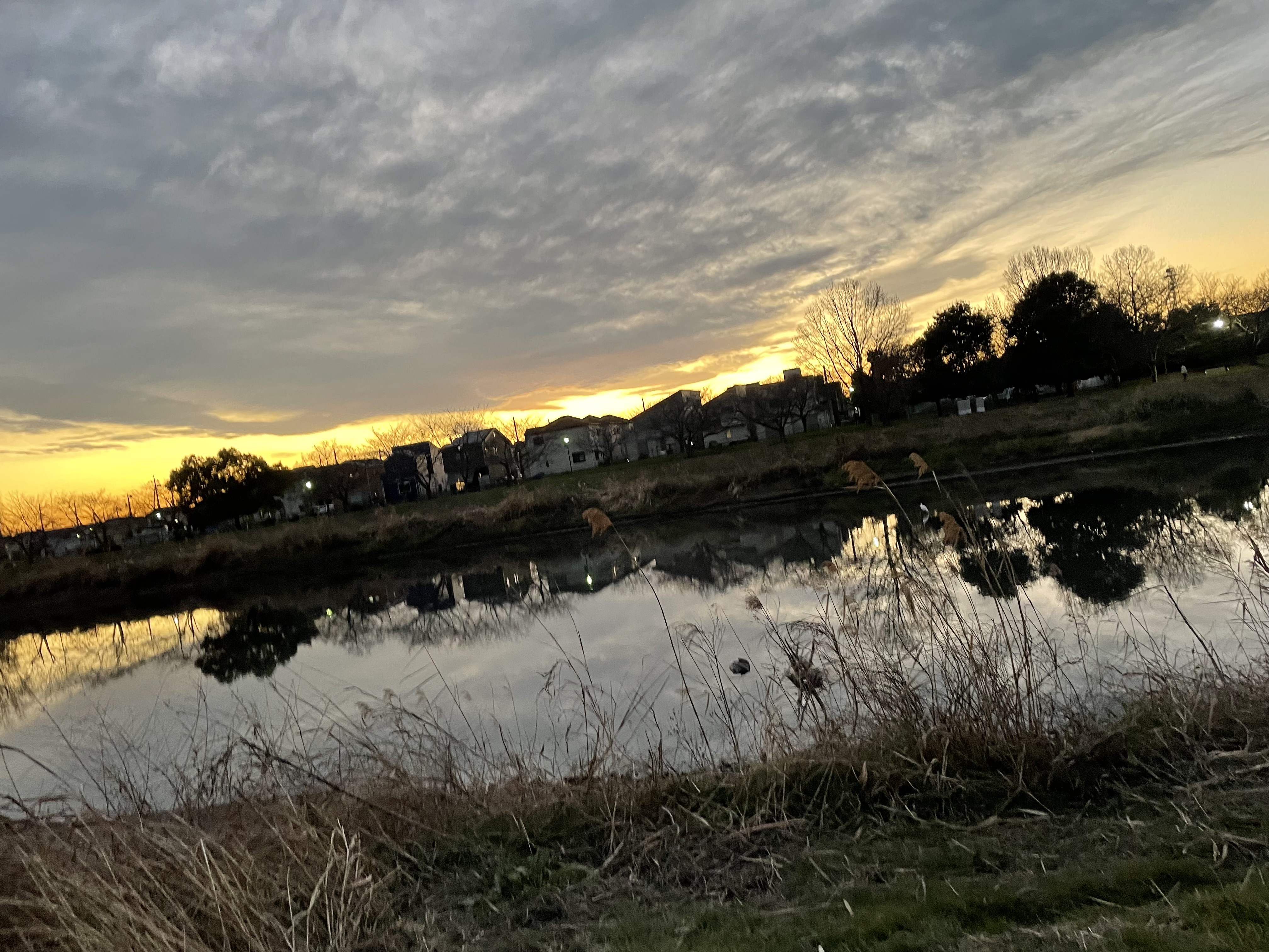 昨日は少し暖かい1日でしたが、今日は朝から風が強くて、体温奪われました。自治会のお餅つき会があって、役員なのでお手伝いに。力仕事はパパさん達が大活躍。それにしても、餅米40キロを釜で蒸して、杵でつくってホントに大変ですね。見てるだけでも、とても大変そうでした。わたしは受付のお手伝いや、子ども達がお供え作りをするのでその準備をお手伝いしたくらいで、あとは寒風吹き荒ぶ中、お餅つきを見守るというね。朝8時に集合で、解散は12時半過ぎでした。チョロジは今日はお留守番してもらっていたので、帰宅してから、チョロジとランチにお蕎麦屋さんへ行き、買い物して帰宅。ルウとコナツにおやつをあげて、買って来た物を片付けてから、明るいうちにお散歩に。寒かったから、少しにしようかと思いながら、川沿いの公園まで。いやはや、座るまもなく夜になってしまいました。お散歩で歩いた川沿いの遊歩道より。夕焼けが綺麗なオレンジ色でした。