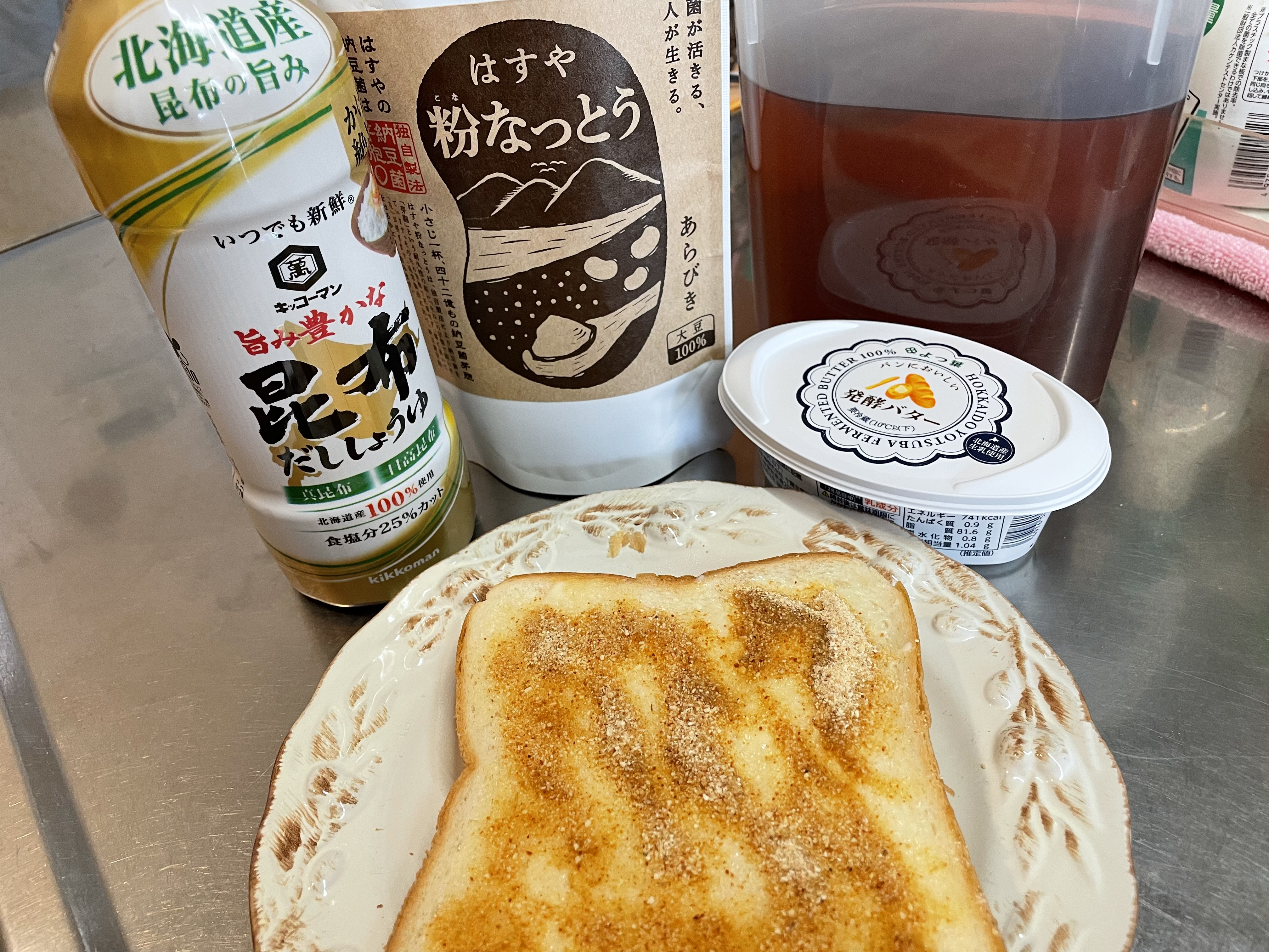以前、何かのTV番組で、津田寛治さんが、お腹が弱くて苦労してたけど、納豆を毎日食べるようになってから調子が良くなった、と話されていました。やはり、納豆はお腹に良いのね。わたしも、お腹弱くて、しょっちゅう痛くなったり、ゆるくなりがちだったりなので、毎日納豆を食べるように。昼か夜に、普通の納豆を食べて、朝はトーストに粉なっとうをかけたりしています。今朝はこんな感じ。トーストして、バター塗って、はすやの粉なっとうをパラパラして、ちょっとだし醤油をかけました。この粉なっとうは、納豆臭さがほとんどなくて、だから、ピーナツバターやジャムの上に乗せても、違和感ないのが良いのです。さらに、普通の納豆よりも、納豆菌がたくさん。小さじ一杯で、42億の納豆菌芽胞が入ってるんだって。お味噌汁に入れてもよし。熱にもつよいらしい。わたし、はすやのまわし者ではありませんが、とっても良くて、愛用してます。もちろん、普通の納豆も大好き。100回混ぜて、ご飯に乗せて食べてるよ〜(^_^;)「そんなことより、あたしのお腹をナデナデしなさいよ」はいはい、お嬢様。