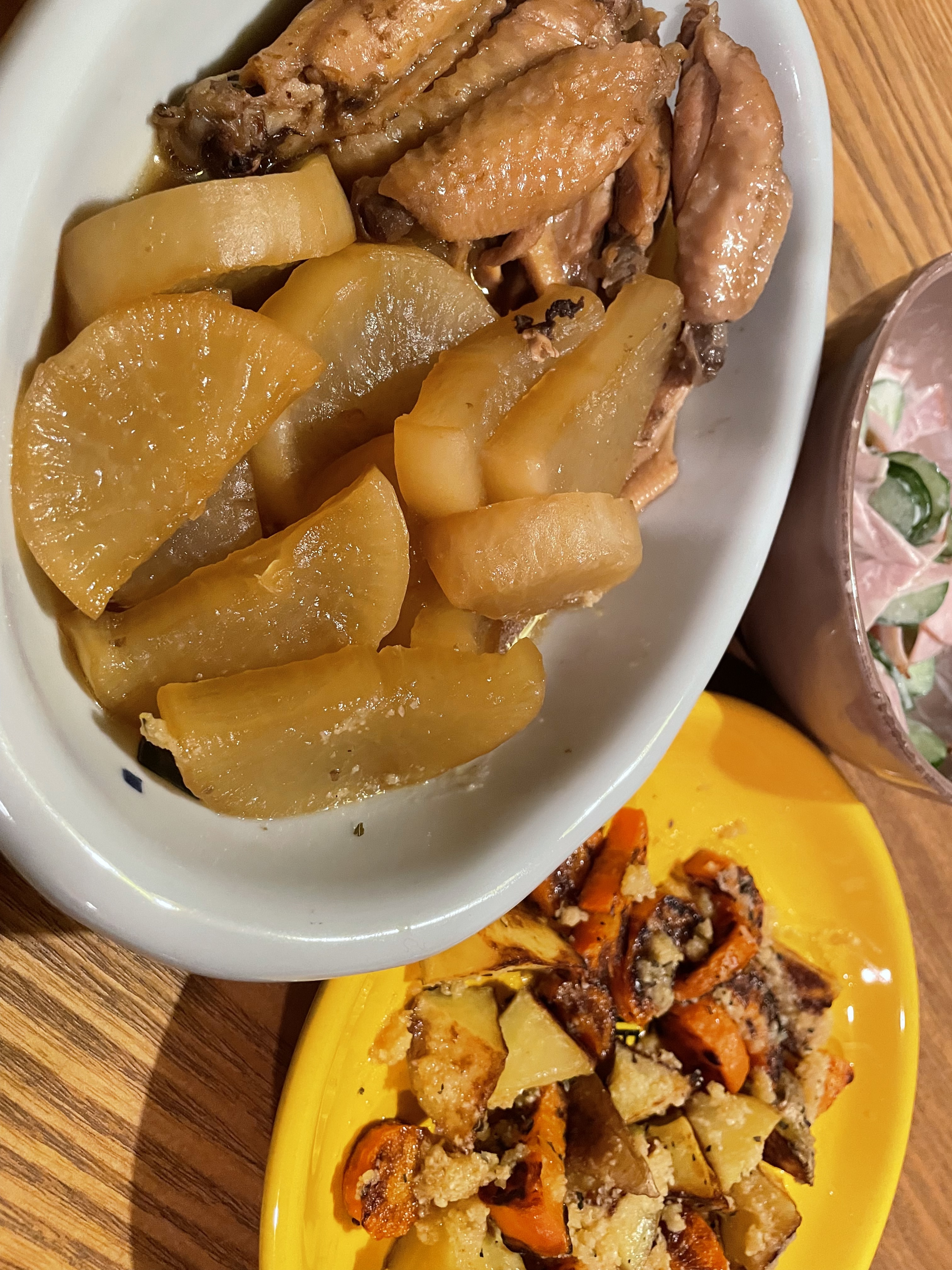 手羽中と大根の煮物でした。先に鶏肉を煮てる間に、大根はレンジで柔らかくしてから、途中で鍋に投入。お酒とお砂糖と醤油、にんにくチューブと生姜チューブも入れてコトコト。味しみじみに出来たら、いつもはあまり大根は食べないチョロジが、大根も食べてくれました。男子はとにかくお肉がいいらしく、お魚焼いたりしてもあまり食べず。でも、焼いたり炒めたりばかりだと、私が胃もたれしてしまうので、時々は煮物もメニューに入れます。わたしひとりになったら、毎日、煮物でもいいけどね(^_^;)さて、今夜は何にしよか。鯵の干物、焼きたいな。「ボクはお魚でもお肉でもOKですよ。」ま、いつもドッグフードしかあげてないけどね。