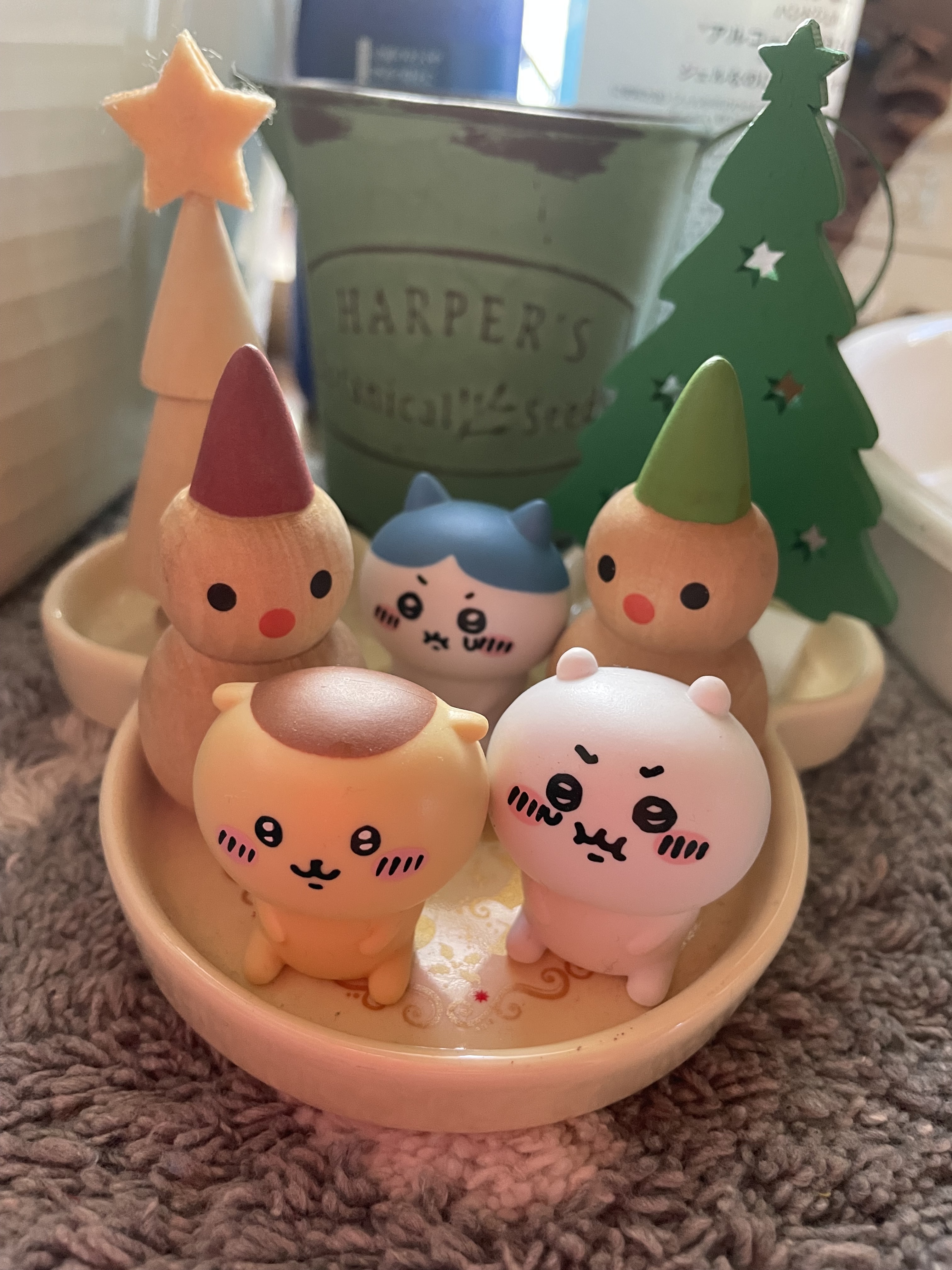 週の始めに、整形外科通院とチョロジの療育と2日続けて外出して、ちょっと疲れたまま動いていたら、昨日の朝は、後頭神経痛が出てしまいました。医者に診断されたわけではないのですが、ネットで調べたりして、たぶんそうであろうと思われる病名です。頭から首のあたりまで、右半分が時々、ズキッと痛むのです。身体を休めて、無理をしなければ、1週間くらいで自然に治るのですが、疲れが溜まったり、ストレスだったりで、時々出る症状です。今朝も変わらずなので、ちょうど整形外科でもらった痛み止めがまだあるので、飲みました。今日は、チョロジは移動支援で出かけてくれたので、外出しないで身体休めます。いよいよ暮れが迫って来て、気持ちは焦るのですがね。玄関の棚にいつも飾っている、ちいかわの小さな置物に、クリスマスの飾りをちょっと追加してみました。みんな100均で購入したものばかりですが、ささやかなクリスマスの飾りです。
