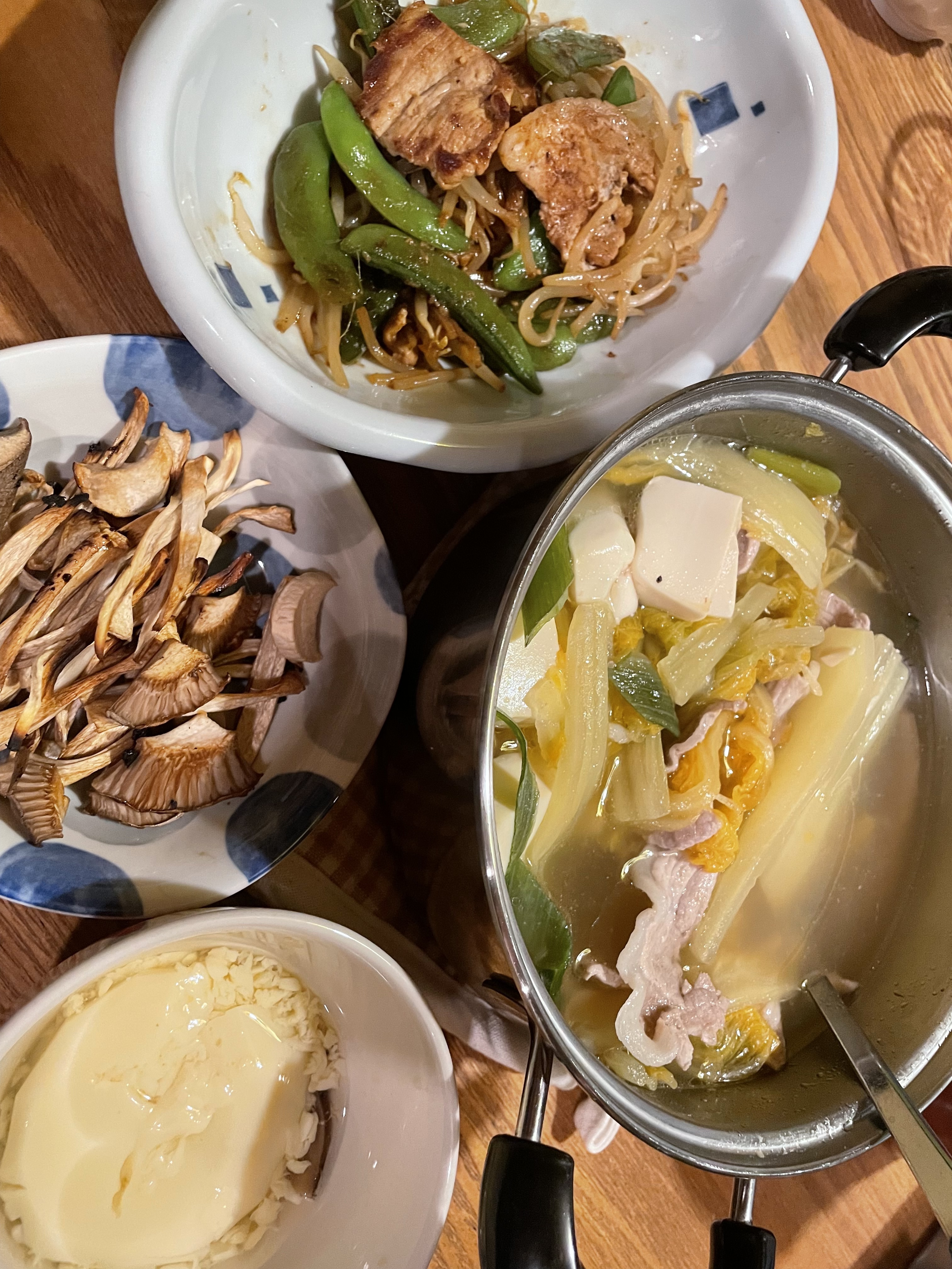 今日の更新は、ついに夜になっちまいました。朝バタバタしちゃうと、ハッと気づいたら夜。。。みたいなね。明日は寒くなるらしい。そう思ったら、寒さ先取りして、夕食メニューが鍋になりました。白菜と豚肉のお鍋と、肉野菜炒め、エリンギを焼いたもの。やる気がある時とない時があるので、日々メニューには悩みます。やる気がまったく出ない時は、お惣菜買って来ちゃったり、冷凍しといたシュウマイをレタスに載せてチンしたり。主婦業してる限りはボケないんじゃないかと思います。段取りとか、けっこう頭使うよね。夕食たべながら、あー明日は何にしようかなぁ、とか考えちゃうのでした(~_~;)「あたしのご飯も、たまには違うのにしてよ」。。。いつものドッグフードですよ( ´ ▽ ` )