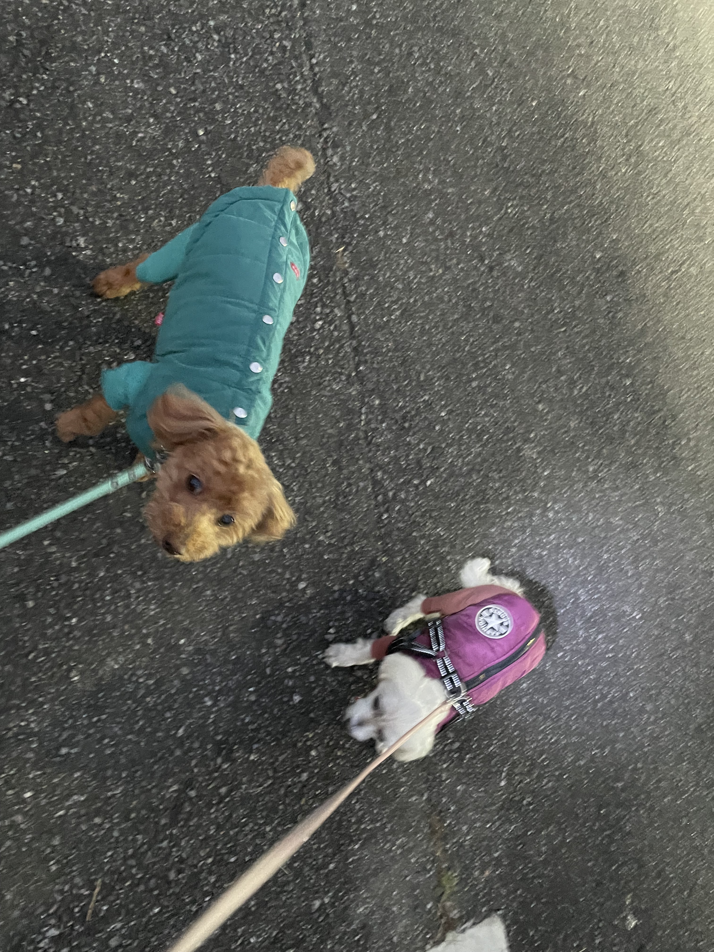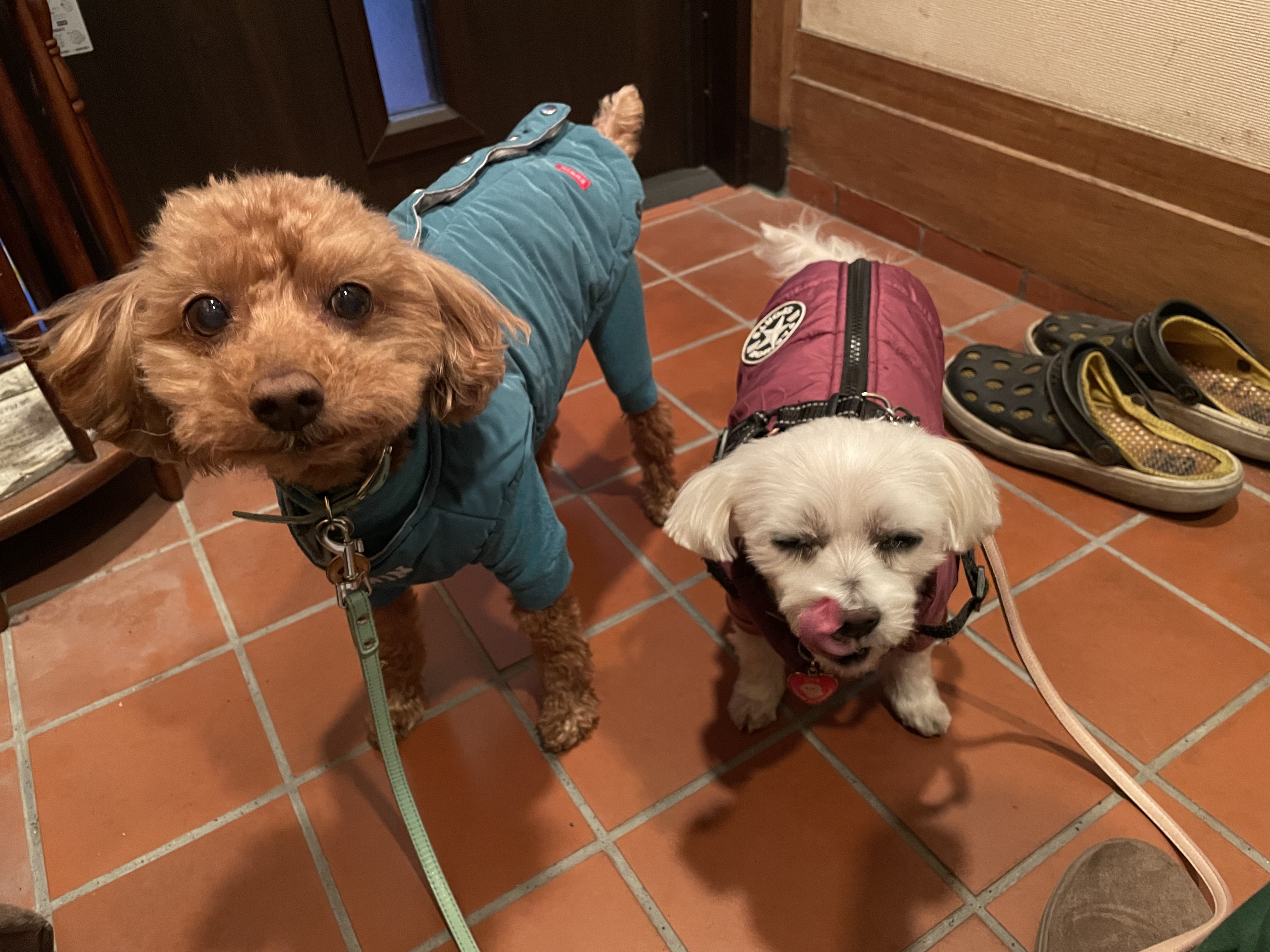 今日は、朝も寒かったけれど、なんだか日中どんどん寒くなって来たかんじ。曇りで、陽射しがなかったら、こんなに寒いのだなぁと思いました。コナツはお洋服着せてるけど、きっとルウも寒いよね。お洗濯も乾かないし。。。ということで、本日は床暖房だけでは足りず、エアコンの暖房もつけました。お洗濯物も部屋干しにして、加湿も兼ねて。昨日も一昨日も、用事があって出かけたので、今日はお昼寝してしまいました。朝、チョロジのお弁当作って片付けて、ルウとコナツのお散歩行って、洗濯して、ルウとコナツの歯磨きとお肌のお手入れしたら、もう限界でした。用事が2日続くと、3日目は撃沈のパターンが多いです。若い時は、毎日がフル回転でも、週末まで元気だったのにね。。。歳には勝てないと言うことかしら。寒かったから、お散歩はふたりとも重装備。ロンパース兄妹。歳を重ねてくると、わんこもおちりが寒いらしいので、ロンパースは良きかな。コナツは白いから、乾燥してる時期になると、お散歩のたびに足が真っ黒になるので、ロンパースで少しは防げるかな。まあ、下の方はどうしても、グレーのソックス履いてるみたくなりますが(~_~;)夏は暑くて、お散歩も過酷だし、冬は足汚れるし、お散歩に良い時期は短いです。
