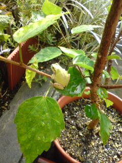 今朝 玄関先の鉢植え ハイビスカスの葉っぱに