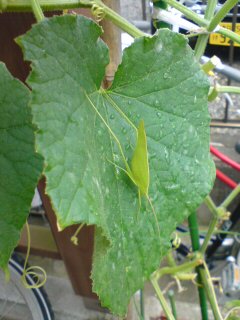 きゅうりの葉っぱの上に、バッタくんがいました。