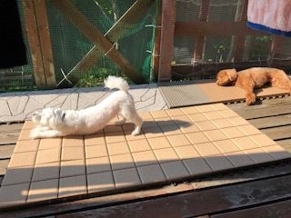 朝、いったんエアコンを切って、窓を開けると、ルウとコナツはベランダで日光浴。