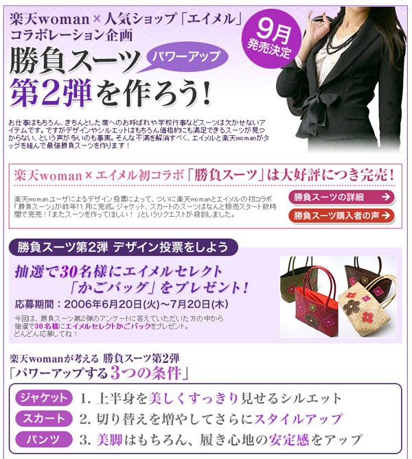 ついに・・・昨年11月販売し、大好評だった勝負スーツの第二弾勝負スーツの販売が決定しました!!! ということでアンケートが昨日20日~スタートしています♪今回はアンケートにお答えいただいた方の中から抽選で30名様にエイメルセレクトかごバッグをプレゼントさせていただきます!!!どうぞご覧くださいませ。
