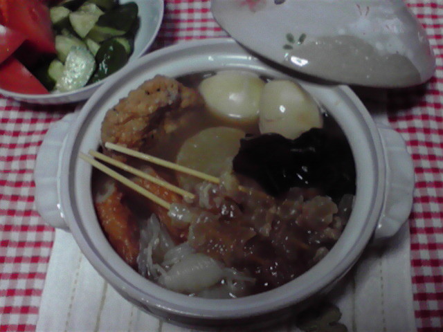 今日はとっても寒い。冬ももう間近といったところか。風邪はあれからひどくなった感じはなかったんだが、鼻声がひどいらしい。(自覚無し)職場で病院行けコールに包まれながら、今日は久々に早退した。(笑)病院でも、とりあえず鼻炎薬をもらっただけで特に何も無し。暇だし寒いので、今夜は煮込み料理にするか!おでんだよ!具は、大根・卵・結び白滝・ガンモ・ごぼ天・角天・牛スジ(アキレス)。出しに使った昆布はもったいなかったので、結び昆布にした。市販のおでん出汁は甘くなるので使わない。昆布と鰹の合わせだしに薄口醤油、酒を入れて煮込む。練り物から甘みが出るので、砂糖や味醂はいらない。いやいや、我ながらうまかった。で、これはおまけ。最近のお気に入りだ。アップルパイだ。もちろん自作じゃない。いや、物まねして自分で作る事もあるんだが、これは違う。熊本にあるブレッド&スイーツLAB.さんで買ったものだ。パンやケーキ、惣菜等いろいろ扱っている、う~ん俺からするとパン屋さんだな。洋菓子をスイーツって呼ぶのは大っ嫌いなので、あえて菓子パンと呼ばせてもらうが、ここのケーキも菓子パンもみんなうまい。店員さんたちも美人ぞろいで…いやいやこれは関係ない。特にお気に入りがこのアップルパイとクロワッサンなんだ。アップルパイは人気が高くていつも買えないんだが、今日は店員さんにわがままを言って分けてもらった。今日はもう晩御飯が終わったんで、明日の朝ごはんのデザートかな。ググってみたんだが、お店のホームページを見つけられなかった。Yahooの地域情報にあったのでこれをリンクしておこう。熊本市内の人、近郊の人はぜひ行って見てほしい。お勧め太鼓判だ!ブレッド&スイーツLAB.(Yahoo地域情報)ではまた。