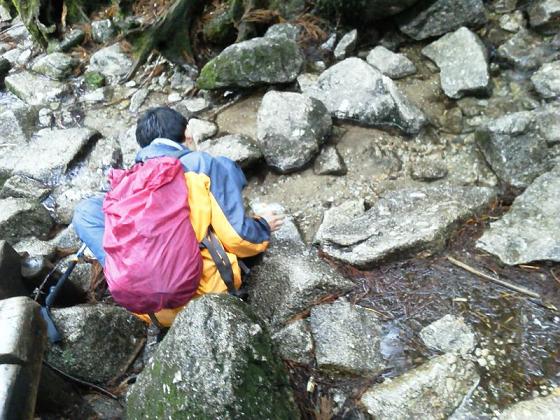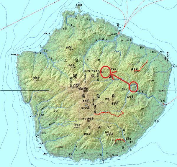 覚えてる間に書き上げちゃうのだ。土砂降りの雨の中、私たちのパーティーは出発しました。その前に、屋久島の地図を見てみましょう。これが屋久島です。東西南北ほぼ円形で、直径が25km前後。縄文杉は島のほぼ中央にあります。ちょっと拡大。赤い円で囲んだところを移動します。私たちの前に出発したパーティーです。トロッコ線路を歩いていきます。私たちは和田さんが先頭で、うちの子が2番、私がしんがりです。足元はびしゃびしゃというか、線路が水没していて、枕木を踏もうとしても見えません。これはフラッシュを使ったので見えていますが、真っ暗でほぼ闇夜。非常に危険なのですが、登山靴のおかげで歩きやすい。少し明るくなってきたので足元を撮影。っていうか、雨がひどくて写真撮影もままならない。デジカメと携帯の両方で撮影しています。線路はずっと登りなのですが、前からどんどん水が流れてくる。例えて言うなら、ディズニーランドのスプラッシュマウンテンとビッグサンダーマウンテンを歩いて行くようなもの。そういえば事前に和田さんから注意がありました。和田さん:”途中、鉄橋をいくつか渡ります。強風が吹いてると動けません。そのときは腰を下げて止まって下さい。風が弱まったら一気に駆け抜けるように。”落ちたら助けにいけませんその理由はすぐに分かった。この流れの上を、この状態で渡るのだ。手すりなし。突風ですwwwほぼ死ねます。というか確実です。自殺したい人はぜひどうぞ。たっぷりスリルを味わった後は単調なトロッコ道。でも眺めはいいですね。トイレ休憩中に出てきたヤクシカ。こっちは角がある。ちょっと横手を見るとこんな風景ですね。トロッコ道のそばは江戸時代からの伐採で、大きな屋久杉はありません。後から植林されたところなので、木々は整列しています。ですが倒木などにはびっしりとコケがついて、地面を覆いつくしています。まるでナウシカに出てきた腐海のよう。トロッコ道を過ぎると、時々屋久杉が見られます。和田さんの説明によると、屋久杉といっても普通の杉なのですが、樹齢1000年を超えたものを屋久杉と言い、数百年程度は小杉と言うそうです。杉の幹にはびっしりとコケが付着してる。高いところにある枝にもコケがついていて、どれだけ雨が多いかが分かる。トロッコ道が終わると、いよいよ本格的な登山が始まるのですが。これ見てください。道らしいところなんかありません。ここをひたすら登ります。この道を、和田さんは折り畳み傘をさして歩いていきます。私と子供はストックを一本使ってる。やっと第一の目的地、ウィルソン株に着きました。江戸時代に伐採された杉の切り株で内部は空洞。大人が20人入れるほどの大きさです。切り株の大きさでは最大だそうです。この中から空を見上げると、切り株の縁がハート型に見える。子:”あとどのくらい?”和田さん:”あと300mだよ。””垂直に300mねw”私&子:”・・・”え~、ここから一気に300m登ります。