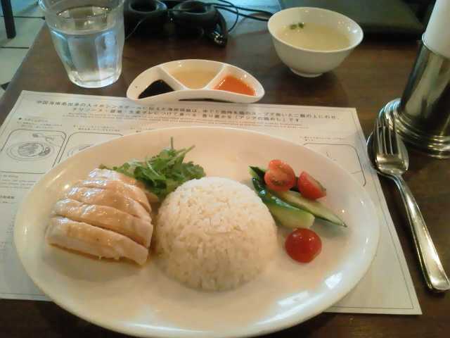 お昼時間に人と待ち合わせの予定が、直前にキャンセルになってしまった。暇になったので麻布十番をぶらぶらと歩く。しかし暑い。何を食べようかと考えていたが。”あ、あれにしよう。”と、六本木ヒルズのほうへ。途中で横道へそれる。店に近づくと、ぷんとカレーの香りが。お昼の時間は満席になることが多いのだが、ちょうど団体客が帰ったところだ。空いてる席に座る。店員:カレーが切れてしまいまして。お昼のランチは鶏飯だけです。それ、目当てで来たんですが。と言うことで写真の鶏飯を食べてきました。十番では有名なシンガポールのお店です。(2店あるんですが、裏通りの方が美味しい)だけど、カレーもいつか食べてみたいな。