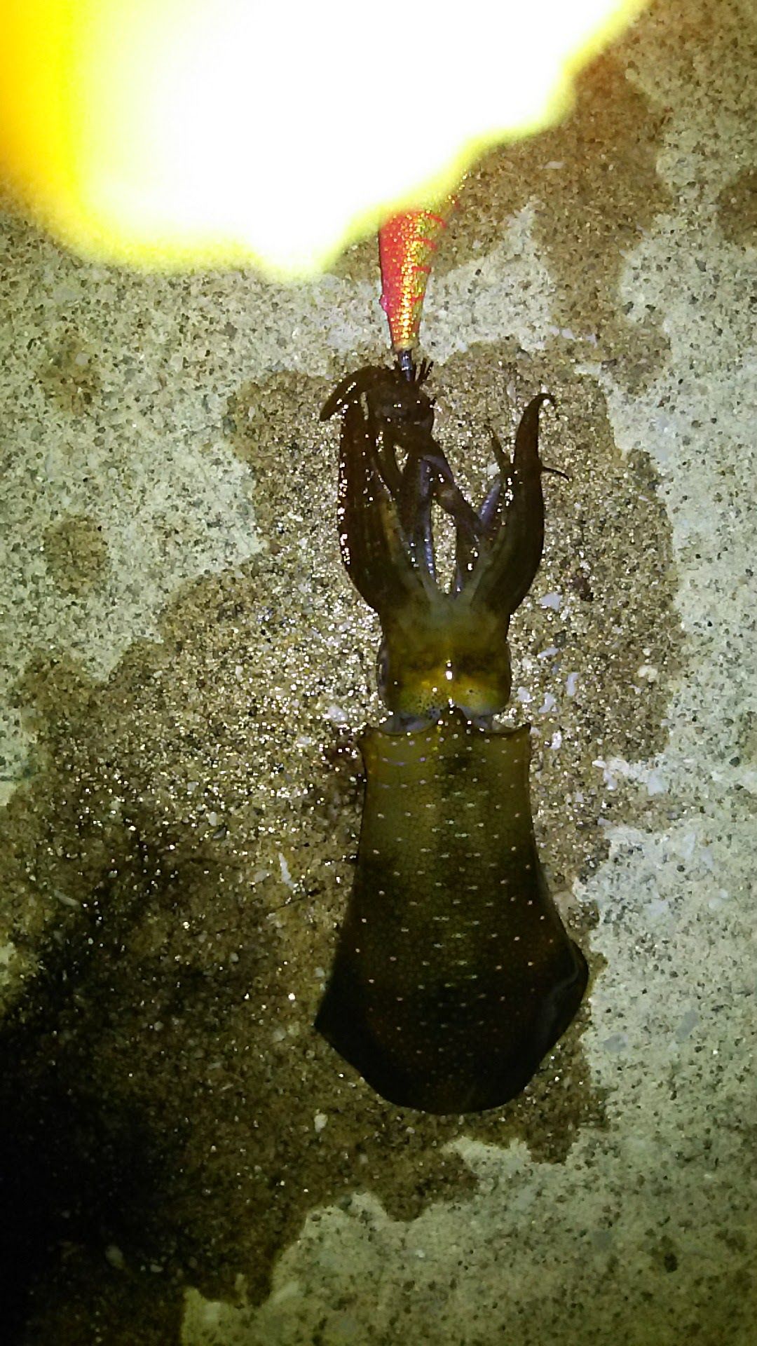 秋は仔イカのシーズン。男鹿半島の方でイカが釣れていると聞き、行ってまいりました。私はイカは初めてですので、いろいろ準備していきましたね。イカ釣りに使うエギと呼ばれるルアーはダイソーで購入。一戸100円ならいくらでも使えるし。椿漁港と言う場所で、夜中の12時頃から開始。でも釣れない・・・。ちょっと飽きてきたので、途中で餌釣りしたら、メバルとアジをゲット。これで坊主は無くなった。だけど相変わらずイカの反応なし。最初は私一人だったんだけど、途中で他の人もやってきた。その人もイカ狙いだったようで、エギを投げている。私もしばらくエギを投げていたら、いきなりグンッと引きが来ました。結構引っ張られる。魚と違うのは緩急がはっきりしてること。で、こいつでした。ちっさいwその後、朝まで粘りましたが、ベラが一匹、あとはチダイだけだったので終了。現場で締めたのですが、表面の斑点は動いてる。まずはイカソーメン。これがうまい!のこりはアクアパッツァにしました。ごちそうさまでした。