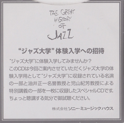 1月22日はジャズの日(JAZZ DAY) 東京都内の老舗ジャズクラブ「バードランド」「サテンドール」「オールオブミークラブ」のオーナーらによる「JAZZ DAY実行委員会」が2001(平成13)年1月22日から実施しています。 JAZZの"JA"が"January"(1月)の先頭2文字であり、"ZZ"が"22"に似ていることから。苦しいけど、これがジャズ人の粋なセンスか?"ジャズ大学"体験入学への招待 ジャズ大学の体験入学用として"ジャズ大学"に収録されている名演の一部と油井正一名誉教授と児山紀芳教授による特別講義の一部を一枚に収録したスペシャルCD。 「テイク・ファイヴ(デイヴ・ブルーベック)」 ミニ講義「ジャズの発生」 ミニ講義「ジャズの初録音」 「アット・ザ・ダークタウン・ストラッターズ・ボール(オリジナル・デキシーランド・ジャズ・バンド)」 ミニ講義「ルイ・アームストロングについて」 ミニ講義「なぜサッチモといわれたか」 「ヒービー・ジービーズ(ルイ・アームストロング)」 ミニ講義「スイングとエリントン」 「A列車で行こ(デューク・エリントン)」 ミニ講義「スイング・ジャズとは」 「レッツ・ダンス(ベニー・グッドマン)」 「ワン・オクロック・ジャンプ(カウント・ベイシー)」 ミニ講義「ビ・バップの発生」 ミニ講義「モダン・ジャズとは?」 ミニ講義「ウェスト・コースト・ジャズの発生」 ミニ講義「バード・バップについて」 「アイ・リメンバー・クリフォード(ドナルド・バード&ジジ・グライス)」 「ソー・ホワット(マイルス・デイビス)」 ミニ講義「ジャズを聞く時に」 油井正一、児山紀芳 CBS SONY(ソニー・ミュージックハウス) FCDP-90042(非売品) 購入年月日:1996年11月7日(ソニー・ミュージックハウス)Facebookページを開設しております、こちらも、時間あればご覧ください。Facebookページ/レコード・ライブラリー中南米音楽、クラシック、ジャズを中心とした幅広いジャンルのアルバムを紹介しています。