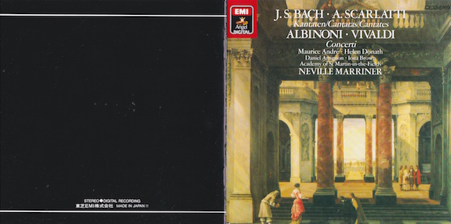 サー・ネヴィル・マリナー/バロック・コンサート ある一夜、名手達を取り揃えた極上のコンサートに招待されたような素敵なアルバムです。演奏も見事だし、曲の配列がいいので最初から最後まで聴き飽きることなく楽しめます。独奏楽器はアンドレのトランペットが主役だが脇役も敗けずうまい。シュテルツェル/トランペット協奏曲は珍しい。 ヴィヴァルディ/2つのトランペットのための協奏曲ハ長調RV.537、F.IX-1、P.75 ヴィヴァルディ/トランペット協奏曲変ロ長調【ob&vn協奏曲RV.548より編曲】 シュテルツェル/トランペット協奏曲ニ長調【原曲:ob協奏曲】 録音:1982年 J.S.バッハ/カンタータ第51番「もろびとよ、歓呼して神を迎えよ」BWV.51(1730初演)【S】 A.スカルラッティ/カンタータ「テブロ川の岸辺で」 録音:1983年 アルビノーニ/トランペットとオーボエのための協奏曲へ長調(5声の協奏曲Op.9-3) 録音:1984年 サー・ネヴィル・マリナー指揮/アカデミー室内管弦楽団 解説:高橋昭、歌詞対訳:小瀬村幸子 ANGEL(東芝EMI) CE33-5169 発売年月日:1989年3月24日 購入年月日:1989年6月24日(サウンドハンター各務原店)Facebookページを開設しております、こちらも、時間あればご覧ください。Facebookページ/レコード・ライブラリー中南米音楽、クラシック、ジャズを中心とした幅広いジャンルのアルバムを紹介しています。