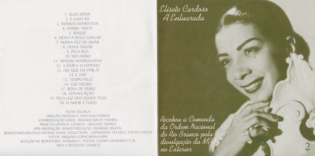 エリゼッチ・カルドーゾ/A Enluarada(4CD)(2/4) CD4枚組BOXセットの2枚目。 「Suas maos(1962)」、「E luxo so(1962)」、「Nossos momentos(1962)」、「Samba triste(1962)」、「Risque(1962)」、「Deixa a nega gingar(1962)」、「Nossa vez de amar(1962)」、「Deixa andar(1962)」、「Pela rua(1960)」、「Molambo(1957)」、「Minhas madrugadas(1965)」、「A flor e o espinho(1965)」、「Diz que fui por ai(1965)」、「E dai?(1965)」、「Tempo feliz(1965)」、「Luz negra(1965)」、「Rosa de ouro(1965)」、「Consolacao(1965)」、「Pela luz dos olhos teus(1963)」、「O amor e tudo(1957)」 エリゼッチ・カルドーゾ COPACABANA(EMI BRASIL) 823761-2(99904)(ブラジル盤) 発売年月日:1998年8月12日(BRAZIL) 購入年月日:1998年7月27日(ラティーナ)Facebookページを開設しております、こちらも、時間あればご覧ください。Facebookページ/レコード・ライブラリー中南米音楽、クラシック、ジャズを中心とした幅広いジャンルのアルバムを紹介しています。