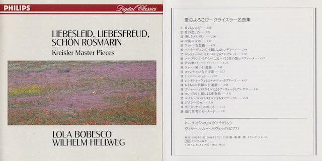 1月29日はフリッツ・クライスラー(墺:作曲家,バイオリン奏者)(86歳)の命日(1962年) 二十世紀を代表するヴァイオリンの巨匠クライスラーは、文字どおり珠玉のように美しいヴァイオリンの小品をたくさん残してくれました。古都ウィーンのロマンティツクな情緒を伝える「愛の悲しみ」や「愛のよるこび」をはじめ、軽快な曲やユーモラスな曲など、すべての曲にヴァイオリンの魅力がみちあふれています。愛のよろこび~クライスラー名曲集 ヴァイオリンの花束ともいうべきクライスラーの愛奏曲集 「愛のよろこび」、「愛の悲しみ」、「美しきロスマリン」、「中国の太鼓」、「ウィーン奇想曲」、「ベートーヴェンの主題によるロンディーノ」、「ボッケリーニのスタイルによるアレグレット」、「クープランのスタイルによるルイ13世の歌とパヴァーヌ」、「昔の歌」、「ウィーン風小行進曲」、「ロマンティックな子守歌」、「シンコペーション」、「レシタチーヴォとスケルツォ・カプリース」、「おもちゃの兵隊の行進曲」、「プニャーニのスタイルによるプレリュードとアレグロ」、「コレッリの主題による変奏曲」、「ルクレーヌのスタイルによるタンブーラン」、「ジプシーの女」、「オーカッサンとニコレット」、「道化役者のセレナード」 ローラ・ボベスコ(ヴァイオリン)、ウィルヘルム・ヘルヴェック(ピアノ) 録音:1985年11月、1984年2月11~12日、オランダ、ユトレヒト 解説:高川清 PHILIPS(日本フォノグラム) PHCP-10115 発売年月日:1992年4月5日 購入年月日:1993年3月27日(名曲堂那加店)Facebookページを開設しております、こちらも、時間あればご覧ください。Facebookページ/レコード・ライブラリー中南米音楽、クラシック、ジャズを中心とした幅広いジャンルのアルバムを紹介しています。