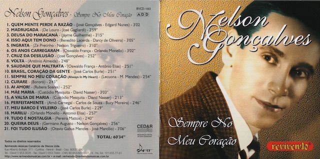 ネルソン・ゴンサルヴィス/センプリ・ノ・メウコラサゥン https://www.vagalume.com.br/nelson-goncalves/sempre-no-meu http://www.mercidisco.com.br/cd-nelson-goncalves-sempre-no-meu http://revivendomusicas.com.br/produto_detalhe.asp?id=1062 ブラジルで最もアルバム・リリースが多いと言われるサンバ・カンサォンの巨人、ネルソン・ゴンサルヴィスのCD。 Quem Mente Perde A Razao Madrugada Deusa Do Maracan Isso Aqui Tem Dono Ingrata Os Anos carregaram Cruz da Desilusao Volta Saudade Que Maltrata Brasil、 Coracao Da Gente Sempre No Meu Coracao Curare Ai Amor Mae Maria A Valsa De Maria Perfeitamente Meu Barco E Veleiro Marilu Tudo E Nostalgia Queira Deus Foi Tudo Ilusao ネルソン・ゴンサルヴィス REVIVENDO(REVIVENDO) RVCD-183 購入年月日:2005年12月17日(ラティーナ)