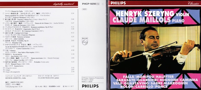 ヘンリック・シェリング/スペイン、メキシコ・ヴァイオリン名曲集 ヘンリク・シェリングがファリャ、サラサーテ、ポンセなど、スペイン、ラテンアメリカの作曲家の曲を取り上げたヴァイオリン・リサイタル盤。メキシコで後進を育て、ポンセとも交友をもち、メキシコを”第2の故郷”とする巨匠シェリングが、深い愛着をもって弾くこれらの曲は、「故郷への頌歌」ともいえる名演となっています。 「「はかなき人生」~スペイン舞曲第1番(ファリャ)」、「歌と踊り第1番(モンポウ)」、「ジプシー娘の踊り(ハルフテル)」、「アンダルシアのロマンスop.22-1(サラサーテ)」、「サバテアードop.23-2(同)」、「遥かなる歌(グァルニエリ)」、「セルタンの夜曲(ミニョーネ)」、「前奏曲op.16(カミーニャ)」、「かがり火のほとりでop.16(ヴァーレ)」、「平原(グァスタビー)」、「祖国から(マロキン)」、「メキシコ舞曲(ロロン)」、「無伴奏の前奏曲(カリーリョ)」、「短いソナタ(ポンセ)」 ヘンリック・シェリング(ヴァイオリン)、クロード、マイヨール(ピアノ) 録音:1969年5月25、28日 解説:濱田滋郎 PHILIPS(日本フォノグラム) PHCP-9256 発売年月日:1994年11月2日 購入年月日:1994年11月26日(エデン美濃加茂店)Facebookページを開設しております、こちらも、時間あればご覧ください。Facebookページ/レコード・ライブラリー中南米音楽、クラシック、ジャズを中心とした幅広いジャンルのアルバムを紹介しています。