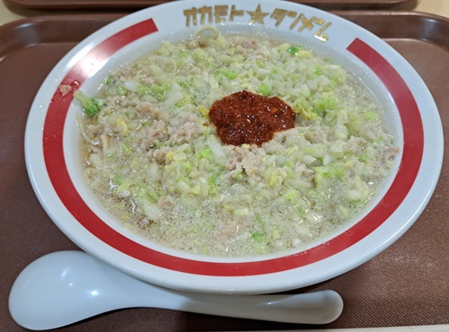 オカモト☆タンメン。で昼食です今月中旬に 初めて食事に行った オカモト☆タンメン。その時 主人の器の底には 【夢】の文字がありそれは 次回タンメン1杯無料券 がいただける印期限が 1ヶ月ほどなので “期限が切れる前に行こう~” と本日のお昼に 行ってきましたタンメン1杯無料と書かれていたので私が タンメン を注文。 今回は 辛さを2辛にしてみました。スープに溶かして いただきます。前回は野菜たっぷりタンメンでざく切りキャベツがたっぷりとトッピングされていましたがキャベツが無くても元々 刻んだ白菜とひき肉がしっかりと入っていますあっさりとしていて 美味しくいただきました主人は 麻辣タンメン とライスを注文。煮たまごをトッピングし 1切れは私に麻辣タンメンには 揚げニンニクがたっぷりとトッピングされています!!明日は 車でお出かけするのに…匂いを気にせずガッツリと食べていました~麻辣 というだけあって 辛みもしっかりとあったようで汗をかきながらも 美味しく完食していました主人は スープまで飲み干したのですが またもや【夢】が!!!会計時 1杯無料券を渡して 主人の分だけお支払い新たに タンメン1杯無料券をいただいてきました。期限の来月末ごろに また行くようです。ブログランキングに参加しています。よろしければ、クリックして応援をお願いします。にほんブログ村簡単料理ランキング