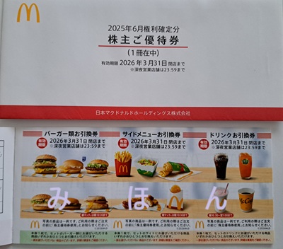 日本マクドナルドホールディングス から優待券が届きました優待権利月は 6月と12月の年2回。1年以上継続保有で 保有株数に応じて優待券がいただけます。100株保有なので 優待食事券が1冊!バーガー類・サイドメニュー・ドリンクの引換券が各6枚ずつです。しばらく保有し続けるようなので毎年 1年間で 12枚いただける予定です。夫婦2人で利用すると6回食事できるため2ヶ月に1回のペースで 券を利用していますたいてい偶数月に利用しているため 今月も利用しておきましょう。ハンバーガーは 期間限定のものを注文するようにしています。10月22日からはストリートファイターとのコラボしているようです。主人は トリチ を。「ストリートファイター」のケンをイメージしたバーガーでビーフパティとチェダーチーズが各3枚入っています。ドリンクも期間限定の マックフィズ みなぎるエナジーを注文。りんご果汁を使用した炭酸エナジードリンクだそうです。私は 油淋鶏マヨチキンこちらは「ストリートファイター」のチェン・リーをイメージされたバーガー。チキンの下には 油淋鶏フィリングが入っています。今日は肌寒い気温だったので ドリンクはコーヒーにしました私は ストリートファイターのことは よく知りませんがハンバーガーは美味しくいただきました油淋鶏マヨチキンには レタスは入っていましたがやはり マクドナルドのバーガーは 野菜っ気が少ない・・・今は スライストマトが無くなっているのが 残念ですね。でも優待食事券で無料で毎回 バーガー・サイドメニュー・ドリンクがいただけるのは有難いですねブログランキングに参加しています。よろしければ、クリックして応援をお願いします。にほんブログ村簡単料理ランキング
