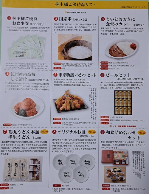 フジオフードグループ本社 から優待品が届きました優待権利月は 6月と12月の年2回。保有株数に応じて 優待品リストから選択できます。・お食事券(3000円分) ・国産米(1.4kg×3袋) ・まいどおおきに食堂のカレー(15個) ・紀州産南高梅(400g×2個) ・串家物語の串かつセット ・ビールセット(350ml×12本) ・鶴丸うどん本舗の半生うどん(6人前)・オリジナルお皿(3枚) ・和食詰め合わせセット 300株保有は 6000円相当いただけるため優待リスト9商品の中から 2セット 選択できます毎回 グループ店舗で利用できるお食事券を選んでいましたが今回は 商品を選びました。ひとつは 前回同様 ビールセット!プレミアムエビス 350ml が 12本です。普段 エビスビールを買うことがないので 嬉しいですね前回とは 一部優待リストが変更されていて お肉が無くなっています・・・なのでふたつめは 新たにリストに加わっていた和食詰め合わせセット にしてみました。東京・恵比寿の名店 [賛否両論]の料理人 笠原将弘 氏が監修された和食セットだそうです。セット内容は大根のそぼろ餡 / 牛しぐれ煮ごぼう鶏肉と野菜の炊き合わせ / 豚角煮豚ロースの醤油煮込み / 豚ばらの味噌煮込みの6品です。冷凍で届いているため 賞味期限は長めもう一品欲しい時などに 重宝しそうです。後日 楽しみにいただきましょう~ブログランキングに参加しています。よろしければ、クリックして応援をお願いします。にほんブログ村簡単料理ランキング