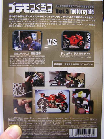 これはオークションで知りました。フジテレビで放映されていたプラモデルの番組を編集したプラモデルの作り方、ハウツー本ではなくDVDです。【送料無料選択可!】プラモつくろう~プロたちの超絶テクニックを映像で観る!~ Vol.5 オートバイ / 趣味教養これはVol5のオートバイ編です。作例は12分の1 タミヤのドゥカティ デスモセディチ楽天内では、組み立てキットで2835円で販売しています。タミヤ 1/12 ドゥカティ デスモセディチおんや?こちらは完成品で6143円だってタミヤ 1/12 ドゥカティ デスモセディチ04#12完成あんれ!これは・・・6分の1もあるんですねメーカーはどこなんでしょう・・・激安の20%OFF!! 1/6 ドゥカティ デスモセディチ#65 CAPIROSSI(キット)【お取り寄せ】私はバイクには興味ないので良くわかりませんが、これだけ商品が出ているって、人気あるみたいですね。プロターのモト・モリーニを作ってから、古いバイク模型が好きになりました。今度作るときにはスポークを張り替えてみようと思っています。プロが作る過程を映像で見られるって、世の中便利になりました。書籍でみるよか、やはり映像はわかりやすい内容は次回でお話しましょう