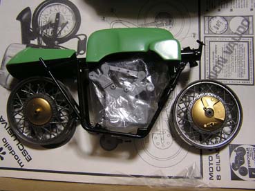 プロターのバイク模型。国産のプラモデルを作りなれている方には即!ゴミ箱へ放り込みたくなる代物です組立て説明図がイタリア語だから?いえいえ、それは当たり前のことですからねそんなんじゃぁありません今回のこのモトグッチ500ccはパーツリストが無いしたがって欠品があるかすぐにチェックは出来ません。わかりにくい、ゴチャッと描かれた少なすぎる解説図と致命的なのはこれ・・・タイヤ、ホイールの組み立て図です。パーツは3と4を合わせるように描かれています・・・が あるホイールのパーツは以下の4つのみ・・・ ねっ!パーツの番号と一致してませんなのに組み立て説明図にはこのようになっています な~んだたいしたことないじゃん!と思ったあなたたのもしいぜひプロターのバイク模型を作って下さいいえ、作りましょう実車は見たことないし、資料も無いしで仲間がいたほうが情報が集まりやすいもんね