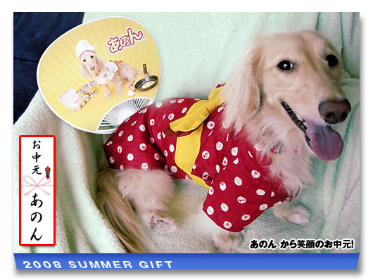 この日記を読んでくださっている みなさまへ 日頃の感謝の気持ちを込めて あのん から 『笑顔のお中元』 をお贈りいたします この お中元は いつもお世話になっている愛犬バビの『犬の視線日記』 fake~ さん ( おにいちゃん )の『笑顔のお中元』 企画に参加して作成して頂きました おにいちゃん は プロのデザイナーさんです を 自由自在に操りCG画像で毎日 楽しませてくれます それから スライドショ~ も 素敵です カワイイ笑顔 の が た~くさん 登場します 夏バテの身体も 元気を取り戻して幸せな気持ちになれます 是非 ご覧下さいマセ おにいちゃん いつも ありがとう ここからは 裏話 に なります 私が おにいちゃん に 送信したのは この画像が おにいちゃん にとって画像を明るくしたり 『のし』を付けるのは 朝飯前です それ以外に CG加工してもらったところが何ヶ所あるか お分かりになりますか ( クイズ みたいですネ )正解は うちわが バランスの良い位置に 移動 背景の 黄色い部分(左上)が 無い あのん の 鼻先上部の くすみが消滅 あのん の 肉球 が キレイになった ( に 気が付いた方は スゴイです )とにかく 音痴の 私はもう ビックリ してしまいました 何故かと言うと アノ 1枚を撮るだけで とても が 掛ったからです 企画は 『笑顔のお中元』 なので が必要です でも あのん は ・・・緊張して 固まって しまいましたぁ そのあと 一緒に かくれんぼ したり おやつ で 気を惹いてみたり でも の ベストショット はなかなか 撮ることが出来ません そして やっと と 思ったら ・・・うちわ が に 反射して失敗 何度か 繰り返しているうちに 『 ママしゃん まだでシュかぁ~ 』 と大 あくび ~~~ とうとう あのん は イジケ虫 に なってしまいました アタチ もう グレちゃう ワン 二人とも ヨレヨレ になりながら それでも 何度か TRY しているうちに な も 撮れてきました コレなんか 可愛い でしょ ボツにするのが 残念 でも この時期 せっかく 浴衣 を 着たので帯 も 上から写っている 最初の に決定 あのん お疲れさまでした ゆっくり ネンネ してね