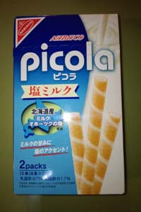 キャンドゥで見つけました。ピコラ・塩ミルク味。確かに塩味の効いたミルク味。ダメじゃないけど、普通にミルクじゃだめなんかい?最近、お菓子にはなんでも塩ですな。流行ってんの?夏だから?でも甘いものに塩は…リクツはわかるけど、私はかけない人間なので、ちょっと抵抗あります。