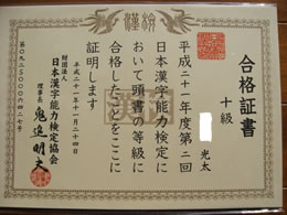 初めて漢字検定を受験、みごと合格した。最初から自信があったものの