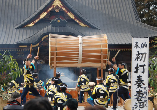 お正月らしく和太鼓など聴きに…妻沼太鼓はかなり格好良いぞ昨晩とは逆に、熊谷市内初詣スポットを 「北から南へ」 縦断~!最初は妻沼聖天山♪午後1時と2時に 「妻沼太鼓初打演奏」 があるので、その時刻に合わせて妻沼入り。妻沼太鼓は昨年のお正月に初めて見て、こりゃ見応えあるね~!と感心感心。で今回は、御本殿改修&石舞台設置後はじめてのお正月ってことで、楽しみ(^^)その石舞台の上で、1時の回は御本殿に向かっての披露♪引き締まった表情に力強くてメリハリのある演奏、変化のある曲、そして時に掛け声やポーズも入ったりして、なかなかに格好良いのだよ。けっこう複雑な構成の曲を3曲、30分以上に渡る舞台…大したモンです♪♪お客さん達も、つい見入っちゃう感じ。14時の回では逆に、御本殿を背にしての演奏。観る側としては、こっちの方がより趣があるかな?御本殿向き=すらっとした仁王門を背にするのも、また良いんだけどね(^^)次なる目的地があるので、2時の回の途中で失礼しちゃったんだけど2時半頃に地震があったね…止まったクルマの中にいて、結構揺れたよ!熊谷市は震度4?多分まだ演奏途中だったよね、最後まで普通にできたのかな?ちなみに渋滞を見越して、少し歩くけど旧坂田医院のところの「妻沼観光駐車場」に車を置いてあるので歩いていくと…ぎゃ~! 門前から旧坂田医院前まで渋滞しちゃってるし(^^;みんな、どこにクルマ置こうとしてるのかな?こんな日は、多少歩くのが苦じゃない御方は、坂田医院の所にとめちゃった方が早いって!お陰で渋滞には一切引っかからず♪さて、熊谷市街地へ飛んで…八坂神社の様子を見てみる♪ちょうど人が去った後なので、お参りしようかな~と思ったらば、靴がぬいてある…中に誰かいらっしゃるのね?私はご近所さんでもうちわ祭関係者さんでもないのでなんとなく遠慮してしまう(^^;じゃあ、すぐそこの石上寺へ!ここ、いつも何となく見物しそびれちゃってたんだ♪ と思ったんだけどあら… そういう事情でしたか…そのまま歩いて、入れない名所・熊谷寺の門だけを眺めて高城神社に行って見ると、やっぱりね~午後3時過ぎても、この行列っ!今日も虚しく列だけ眺めて帰るのでした…最後に荒川を渡って文殊寺へ! ココもさすがに賑わってるね♪でも賑わい過ぎっていうか…参拝者さんの列は、入口の赤門の前まで達する!こうして元旦昼間も、どこにも正式参拝せずに終わったのでした…ま、最初からそのつもりだったけどね。何日かして落ち着いてからでいいや(^^)ところで文殊様は、境内の駐車場はまあムリだろうから手前の第2駐車場にとめたんだけど、クルマを置くまでに10分は行列したかな?そして駐車場への道は、こんな天気のよい日は土煙がスゴイのであります(^^;