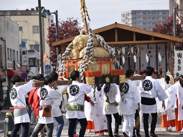 熊谷祇園会の方々が運ぶ万灯みこしとえびす様、それと猿田彦大神様。