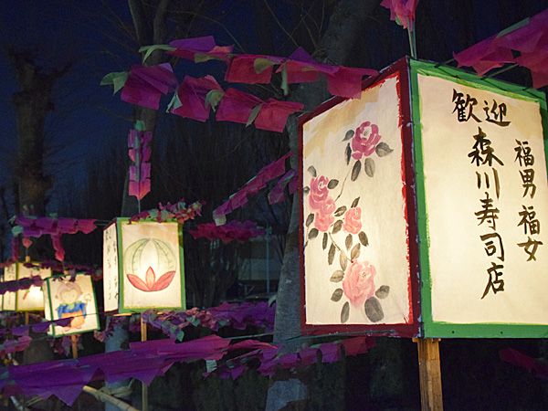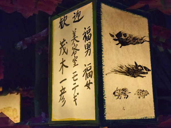 飾られた万灯の灯りと、そこに描かれた手描きの絵を楽しみましょう