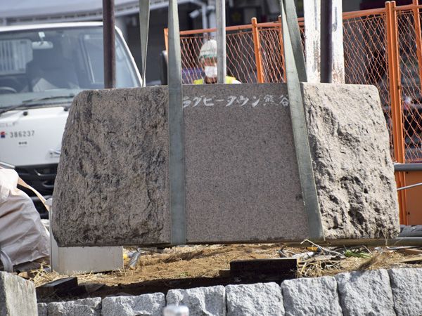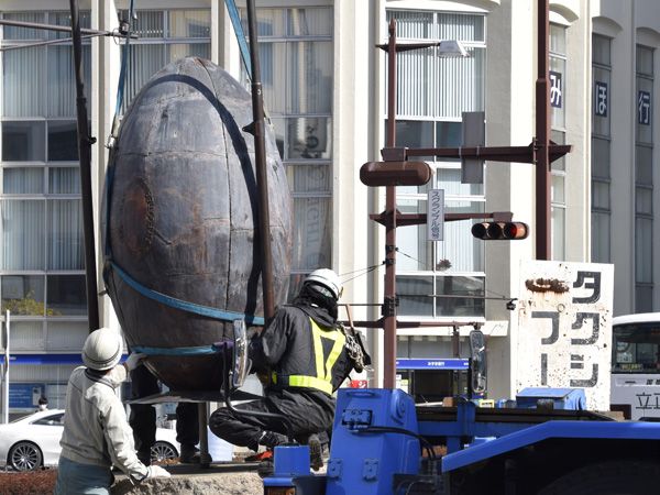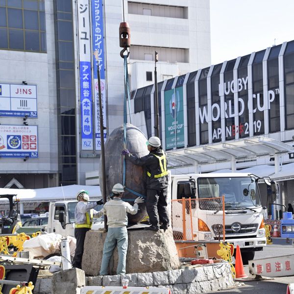 ラグビーのモニュメントが、植え込みに「仮置き」っぽく置かれていて